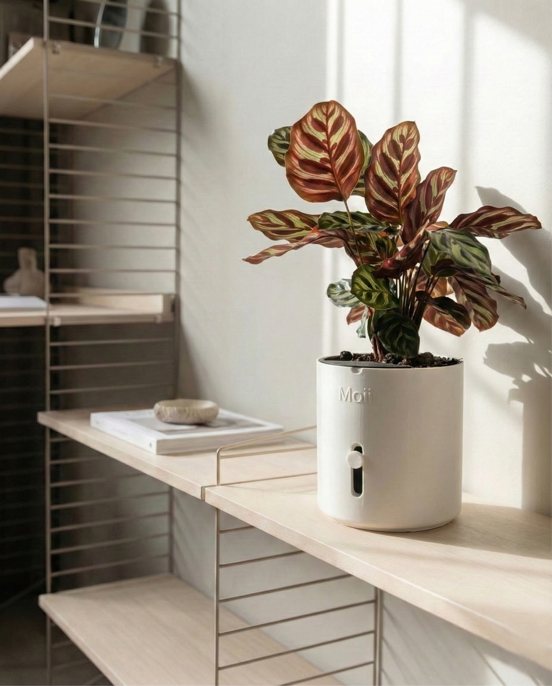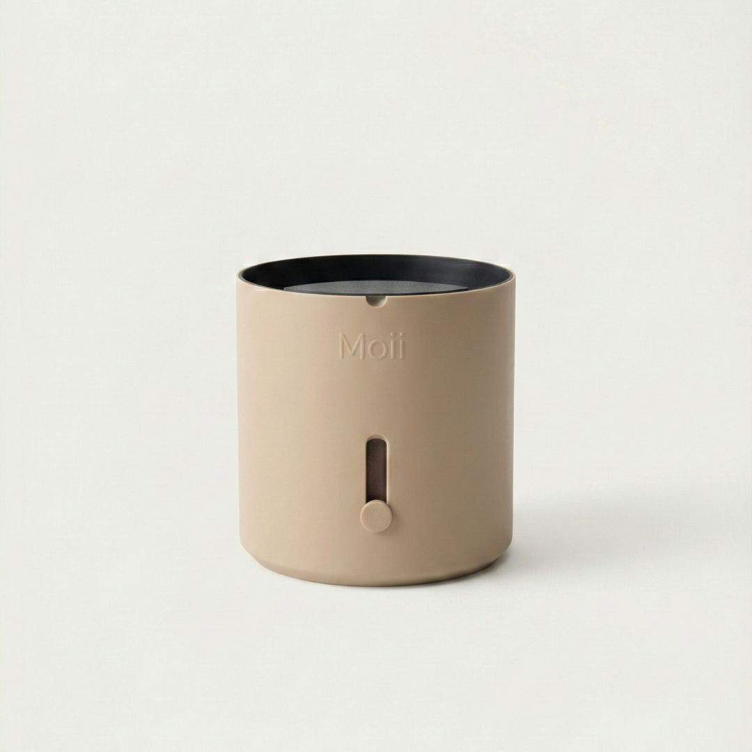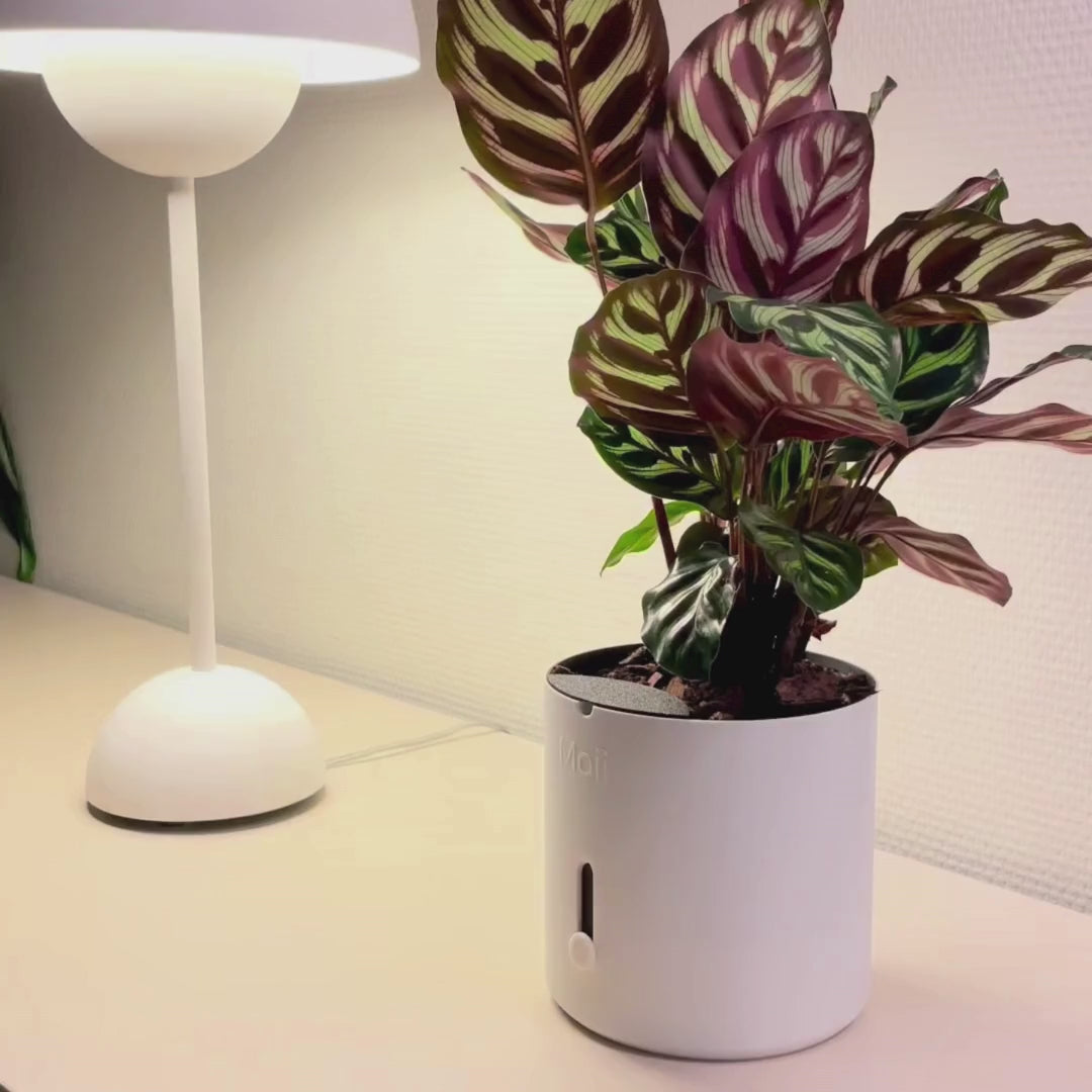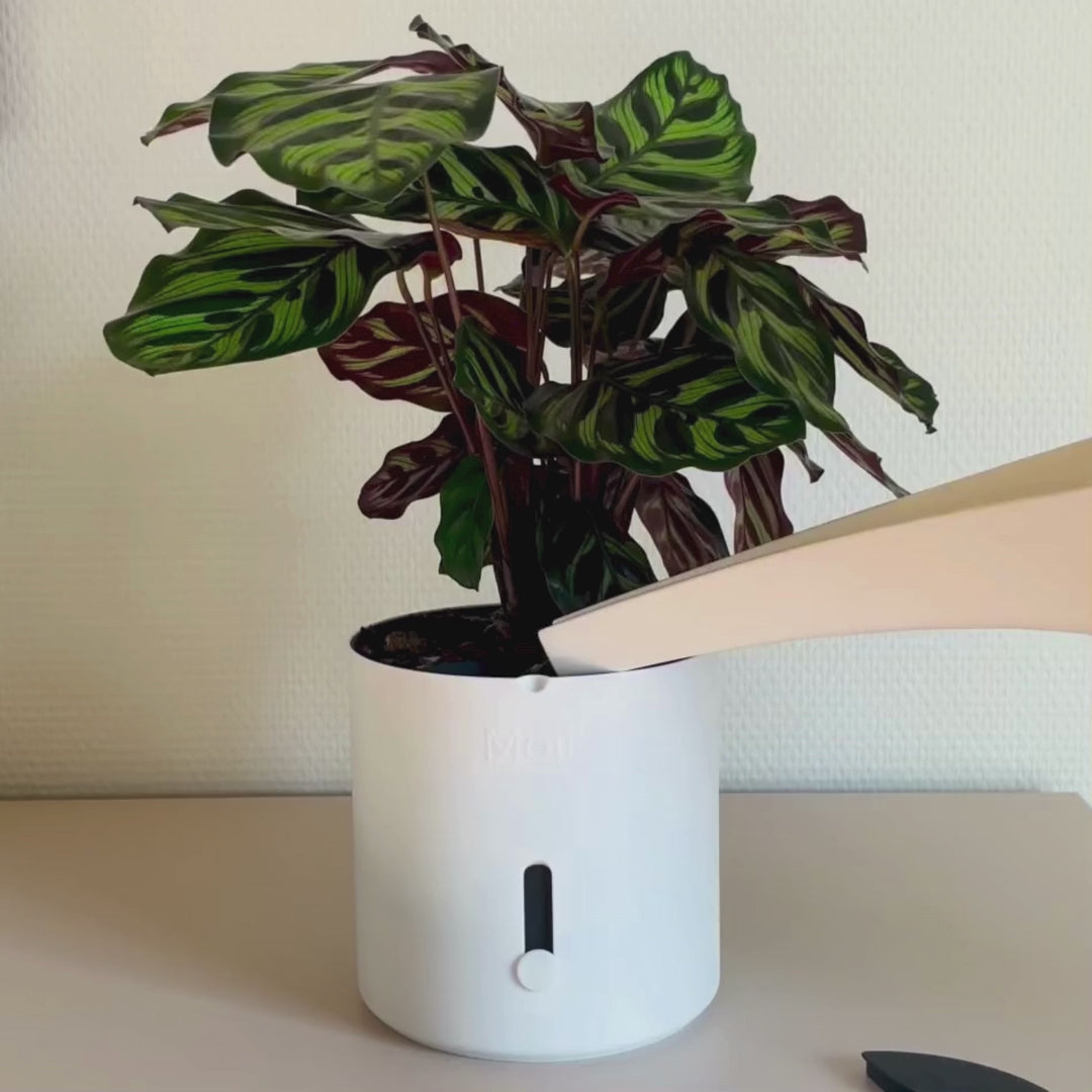 Hver del i Moii selvvandingspotte har én funktion: at gøre dit liv nemmere. Den holder på vandet, viser dig hvornår der mangler, og får planten til at trives uden du behøver at huske på den.